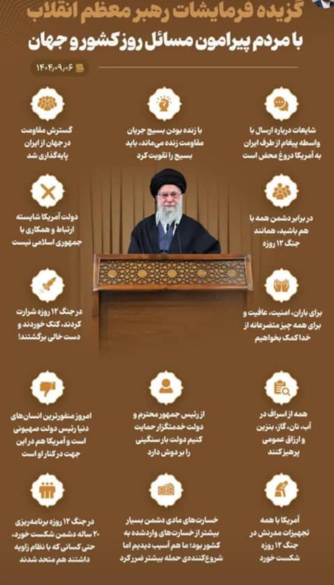 ساعاتی پیش، رهبر انقلاب در سخنانی که بازتابی گسترده در میان مردم و تحلیلگران داشت، به مجموعه‌ای از مسائل کلان کشور و جهان اشاره کردند؛ موضوعاتی که هر کدام به‌تنهایی می‌تواند محور یک گفتمان عمیق سیاسی، فرهنگی و اجتماعی باشد. چکیده‌ای که در تصویر منتشر شده، دریچه‌ای برای فهم لایه‌های پنهان‌تر این سخنان است؛ لایه‌هایی که بیش از هر چیز، بر «امید»، «استقامت»، «هوشیاری» و «هویت» تکیه دارد؛ مفاهیمی که نه‌فقط در سیاست، بلکه در زیست روزمره ملت‌ها نیز نقشی حیاتی دارند.