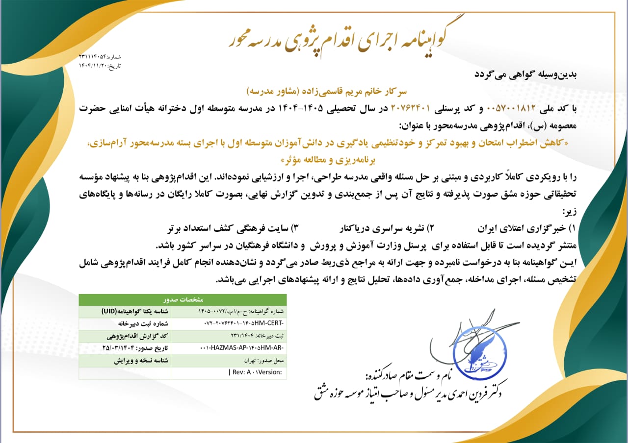 در مدرسه متوسطه اول، اضطراب امتحان یکی از مهم‌ترین عوامل افت عملکرد، بی‌انگیزگی، بی‌قراری، فراموشی مطالب و حتی پرخاشگری پنهان در برخی دانش‌آموزان است. این اقدام‌پژوهی با هدف کاهش اضطراب امتحان و ارتقای تمرکز و خودتنظیمی یادگیری، یک بسته کاربردی مدرسه‌محور را در سه سطح دانش‌آموز، والدین و دبیران اجرا می‌کند. بسته شامل آموزش مهارت‌های آرام‌سازی (تنفس، ریلکسیشن، ذهن‌آگاهی کوتاه)، مهارت‌های برنامه‌ریزی و مدیریت زمان، روش‌های مطالعه مؤثر و راهبردهای شناختی-رفتاری برای اصلاح افکار اضطراب‌زا است. داده‌ها با ابزارهای ساده و قابل اجرا در مدرسه (پرسشنامه اضطراب امتحان، چک‌لیست تمرکز در کلاس، ثبت مطالعه، نظر دبیران و والدین، و مقایسه نمرات آزمونک‌ها) گردآوری می‌شود. نتایج مورد انتظار شامل کاهش نشانه‌های اضطراب، افزایش نظم در مطالعه، بهبود حضور ذهن در کلاس و رشد عملکرد تحصیلی در آزمون‌هاست. این اقدام‌پژوهی بر پایه مشارکت فعال دانش‌آموزان و تعامل نزدیک مشاور با خانواده و دبیران طراحی شده تا در زمان کوتاه، اثر ملموس و قابل سنجش ایجاد کند.