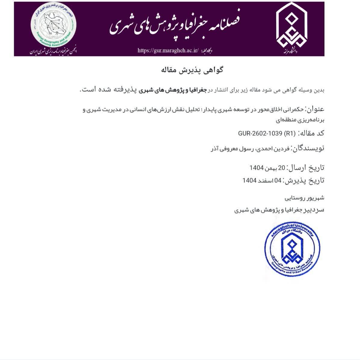 پذیرش و تأیید مقاله علمی «حکمرانی اخلاقمحور در توسعه شهری پایدار» در فصلنامه جغرافیا و پژوهشهای شهری دانشگاه مراغه